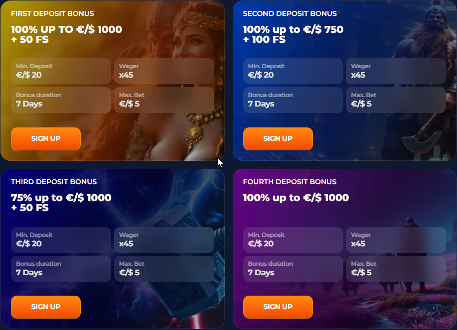 New players at Axe Casino are welcomed with a bonus package that can reach up to €3750 along with 200 free spins across your initial four deposits. This substantial offer sets a great tone for your gaming journey, and transparent terms along with reasonable wagering requirements make it even more attractive. From your very first spin, you’ll feel like a VIP.