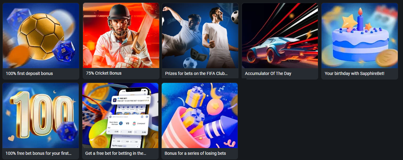 SapphireBet is packed with thrilling sports bonuses, including a 100% welcome offer, reload bonuses on Fridays, weekly cashbacks, free bets, and special birthday gifts. Whether you're a newcomer or a veteran bettor, there's plenty to enjoy from this lively and rewarding platform that keeps the excitement alive all week long!
