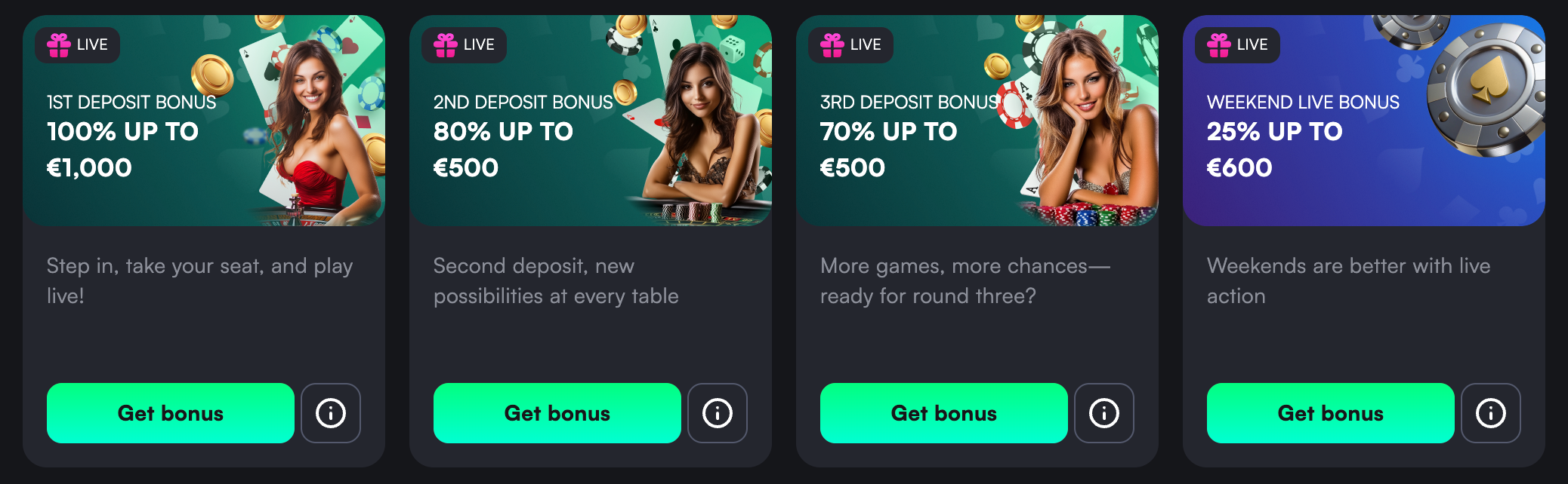 For those drawn to the thrill of live gaming, the Live Casino Welcome Pack provides up to €2,000 over three deposits: