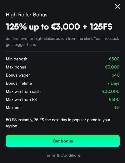 TrueLuck doesn't merely welcome newcomers; it envelops them with exceptionally appealing offers. New players can select from two exciting welcome packages: